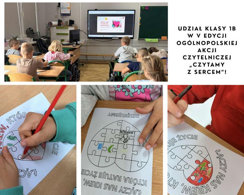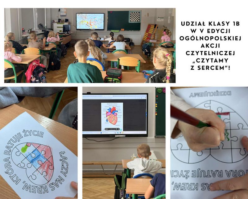 W poniedziałek 29 września 2025r. uczniowie klasy 1b wzięli udział w ogólnopolskiej akcji „Czytamy z sercem”, której celem jest promowanie czytelnictwa oraz szerzenie wiedzy na temat zdrowia serca. Na tej lekcji połączyło dwie ważne wartości – miłość do książek i troskę o zdrowie. Uczniowie rozmawiali o emocjach i empatii, a także uczestniczyli w zajęciach poświęconych zdrowemu stylowi życia. Wspólnie wykonali prace plastyczne. Dzięki zajęciom uczniowie przekonali się, że czytanie rozwija nie tylko umysł, ale i serce.