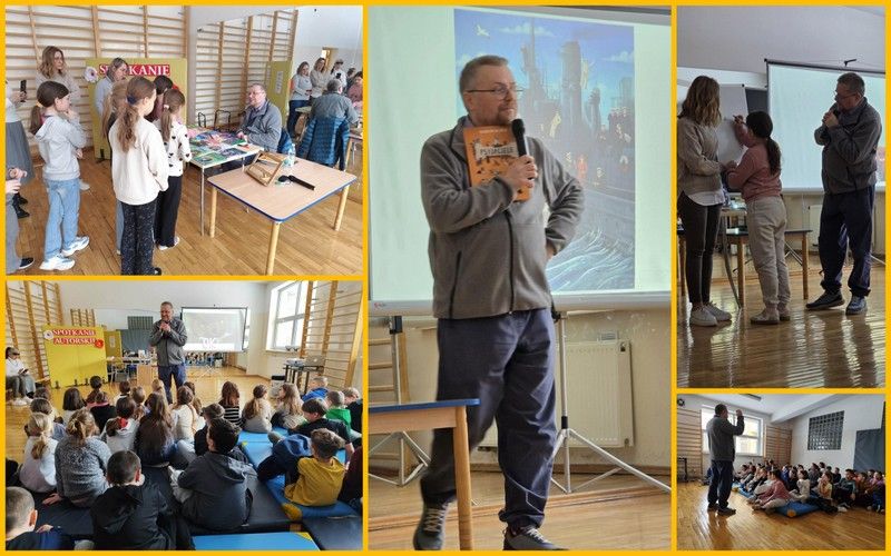 W czwartek, 19 lutego, gościliśmy w naszych progach znanego i cenionego pisarza książek dla dzieci i młodzieży Pana Marcina Kozioła. Uczniowie klasy 2a, 2b, 2c, 2e, 3c i 3e mieli niecodzienną okazję, by osobiście poznać autora, jego twórczość i zaprzyjaźnić się z książką w zupełnie innych niż zwykle okolicznościach. Pan Marcin z lekkością i pasją godną człowieka kochającego pisać nawiązał doskonały kontakt z młodymi odbiorcami i oczarował ich barwną opowieścią o sobie i swoich książkach połączoną z pokazem multimedialnym z udziałem znanych postaci ze świata kultury i nauki. Przybliżył dzieciom bohaterów i opisał niektóre z ich przygód, rozbudził w dzieciach ciekawość prowadząc z nimi rozmowę pełną intrygujących pytań i zagadek, odkrył też rąbek tajemnicy pokazując w jaki sposób i w jakich okolicznościach powstawały zdjęcia miejsc opisanych w niektórych z prezentowanych książek. Dzieci miały okazję do wykazania się wiedzą, kreatywnością i talentem plastycznym rysując bohatera książki „Pogoda dla puchaczy”. Po spotkaniu, które przebiegało w miłej, przyjaznej, radosnej i twórczej atmosferze, uczniowie mieli możliwość dokonania zakupu książek i otrzymania autografu pisarza. Może to krótkie, ale niezwykle owocne spotkanie będzie dla dzieci inspiracją do sięgnięcia po pióro i napisania swojego pierwszego utworu? A może wzbudzi w nich jeszcze większą motywację do czytania i zapał do książek, którego nikt nigdy nie ostudzi?