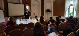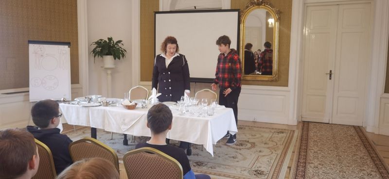 Rozmawialiśmy także o tym, w jakim szkle powinniśmy pić napoje oraz które wino jest dobre do jakiej potrawy. Pod koniec rozmowy pani zaprosiła trzech kandydatów, którzy zademonstrowali, czego się nauczyli. Miło było patrzeć, gdy kolega z klasy VII służył pomocą młodszej koleżance, np. odsunął jej krzesło, nalał wodę. Później zeszliśmy na dół do restauracji I tam zjedliśmy pyszny obiad składający się z przystawki, zupy, drugiego dania i deseru. Staraliśmy się podczas jedzenia wykorzystać zdobyta wiedzę, ale … nie było to takie proste! Łokcie uciekały, sztućce się nas nie słuchały.