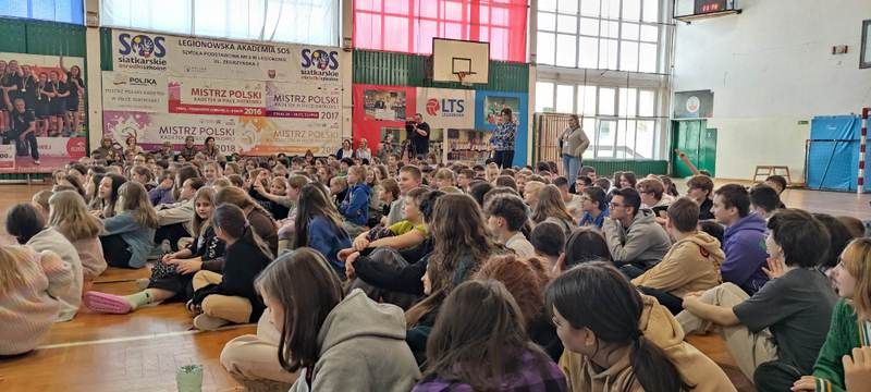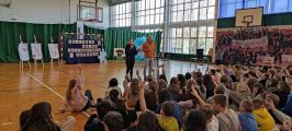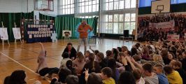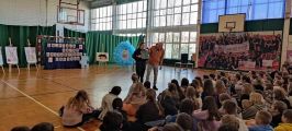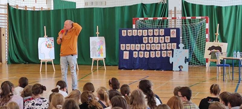 3 kwietnia rozpoczęliśmy szkolne obchody Światowego Dnia Świadomości Autyzmu. Mieliśmy zaszczyt gościć znanego aktora pana Pawła Burczyka z córką Wiktorią, a także panią Kasię Jaworską - pomysłodawczynię naszego spotkania i mamę jednej z naszych uczennic. Aktor w niezwykle energetyczny, charyzmatyczny sposób przedstawił dzieciom co jest ważne dla każdego, poszerzył wiedzę uczniów naszej szkoły na temat osób ze spektrum autyzmu. Na część spotkania Wiktoria przejęła we władanie mikrofon bardzo chętnie odpowiadała na pytania zadawane z publiczności. Osobom chętnym namalowała literkę A powiedziała o sobie, Dla szkoły przekazała własnoręcznie namalowany obraz, który został umieszczony w centralnej części dekoracji związanej z autyzmem. Niezwykle wzruszył ją upominek otrzymany od uczniów.