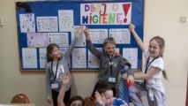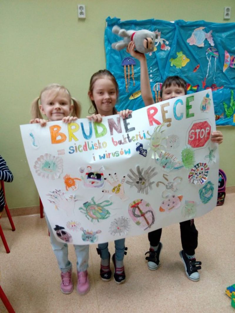 W zakresie profilaktyki zdrowotnej p.Asia, p.Ela i p.Iza przeprowadziły z uczniami cykl zajęć na temat przestrzegania higieny, w tym częstego mycia rąk mydłem i ciepłą wodą (rekomendacje MEN w zakresie profilaktyki). Dzieci wiedzą już, że mycie rąk to najprostsza i jedna z najbardziej skutecznych metod zapobiegania różnym chorobom. Dla naszych uczniów, to nic trudnego, ale jest to czynność, którą nasi najmłodsi często wykonują pobieżnie i nieprawidłowo, dlatego dokładnie omówiliśmy instrukcję mycia rąk. Podczas zajęć uczniowie dowiedzieli się czym są wirusy i bakterie, wiedzą, że wirusy są wszechobecne i spotykamy się z nimi wszędzie. Wspólnie zrobiliśmy „Test złych Mikrobów”, wykonaliśmy śmieszne rysunki wirusów i plakaty zgodne z tematem. Z naszych prac powstała gazetka świetlicowa.