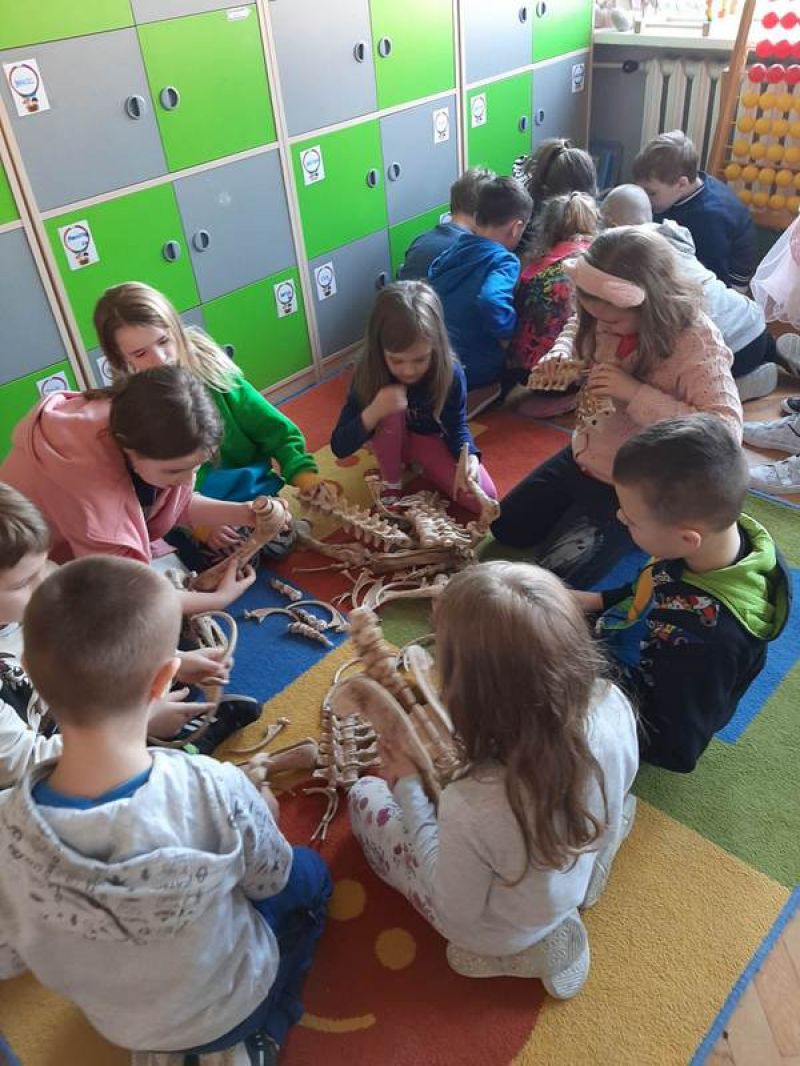 W dniach 18.04 i 24.04 uczniowie z klas 0a, 1a, 1b, 1c, 1d, 1e, 2a, 2c, 2d, 3b i 3d wzięli udział w warsztatach paleontologicznych. Uczniowie dowiedzieli się kiedy i w jakich warunkach żyły dinozaury, co to skamieniałości, amonity oraz wiele innych ciekawostek. Każdy mógł też samodzielnie wykonać gipsowy odlew muszli, a także w zespołach spróbować złożyć szkielet dinozaura. Zajęcia bardzo zainteresowały zarówno tych najmłodszych jak i najstarszych uczestników warsztatów.