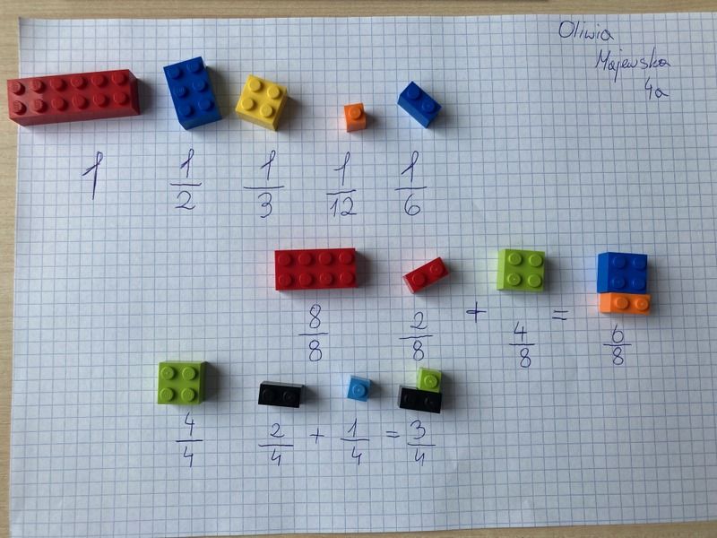 14 czerwca br. uczniowie klasy 4b i 4a na lekcji matematyki doskonalili umiejętność dodawania i odejmowania ułamków zwykłych o tych samych mianownikach przy użyciu klocków Lego.
