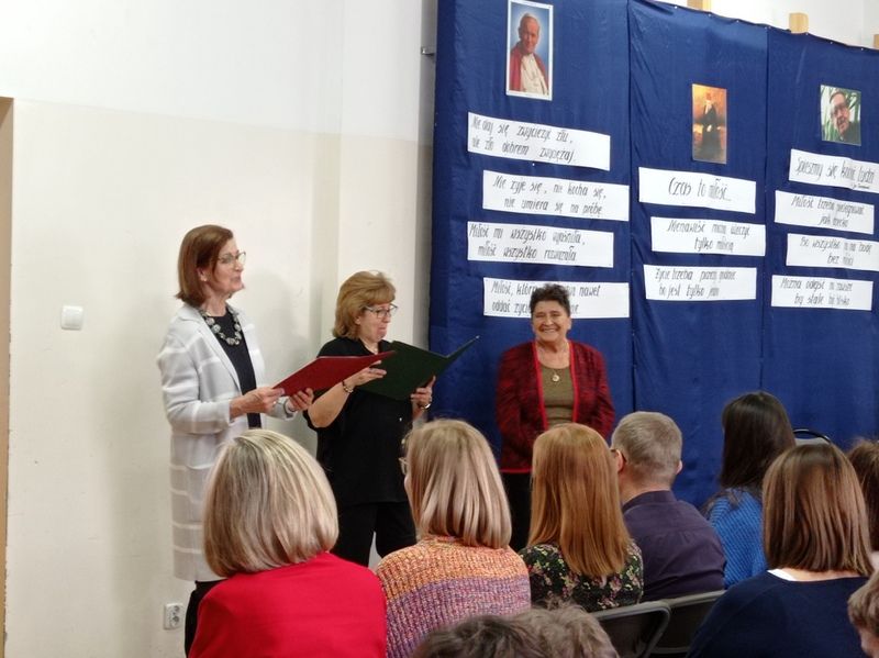 Następnie pani doktor poetka barwnie i z humorem opowiedziała nam o swojej młodości, inspiracjach poetyckich i przyjaźni z księdzem Janem Twardowskim, którego poznała w 1984 roku, co bardzo miło wspomina, ponieważ wcześniej lubiła recytować jego wiersze. Trudno jej było uwierzyć, że poeta, którego tak podziwiała, zaprosił ją do siebie. Ksiądz Twardowski miał duży wpływ na twórczość poetycką bohaterki spotkania. To on namówił panią Aldonę do pisania po przeczytaniu jej wierszy, których jakości nie była pewna. Od tej pory zawsze pokazywała nowe teksty księdzu Twardowskiemu. Jednak pierwszym czytelnikiem jej utworów był syn Sergiusz i tak pozostało do dzisiaj.