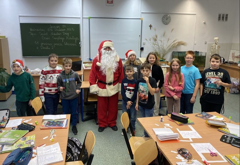Jak co roku 6 grudnia obchodzimy popularne Mikołajki. Z tej okazji uczniowie z klasy 4a uczestniczyli w lekcji języka angielskiego, podczas której poznali słownictwo związane ze świętami Bożego Narodzenia oraz historię samego świętego Mikołaja. Część uczniów była zaskoczona, że był on biskupem i pochodził z Turcji! Uczniowie chętnie uczestniczyli w zajęciach. Wszystkim udzielił się świąteczny nastrój po obejrzeniu zabawnego filmiku, w którym święty Mikołaj z powodu swojego dorodnego brzucha nie mógł przecisnąć się przez komin, aby zostawiać prezenty pod choinką dla dzieci. Na uczniów czekała też miła niespodzianka. Odwiedził ich bohater dzisiejszej lekcji czyli… sam święty Mikołaj! Oczywiście skorzystaliśmy z tej okazji i zrobiliśmy sobie z nim wspólne zdjęcie. Zresztą sami zobaczcie!