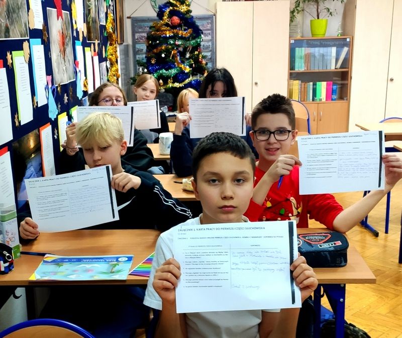 Po wysłuchaniu pierwszej i drugiej części słuchowiska uczniowie wypełniali karty pracy, odpowiadając na pytania i dzieląc się emocjami, które im towarzyszyły. Zwieńczeniem projektu było wykonanie kopii bombki, którą Pan Aureliusz Dembiński zrobił w obozie jenieckim w Memmingen w grudniu 1944 roku.