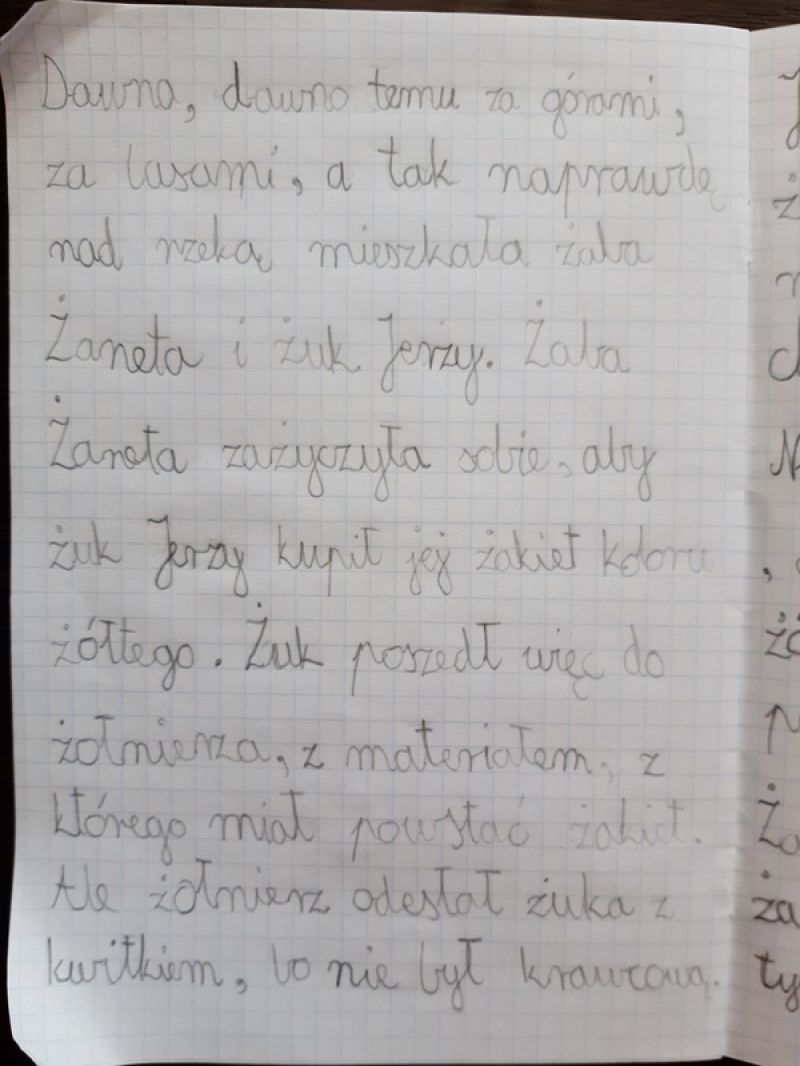DAWNO, DAWNO TEMU, ZA GURAMI, ZA LASAMI, A TAK NAPRAWDĘ NAD ŻEKĄ MIESZKAŁA ŻABA RZANETA I ŻUK JEŻY. ŻABA RZANETA ZARZYCZYŁA SOBIE, ABY ŻUK JEŻY KUPIŁ JEJ RZAKIET KOLORU RZÓŁTEGO. ŻUK POSZEDŁ WIĘC DO RZOŁNIEŻA, Z MATERIAŁEM, Z KTÓREGO MIAŁ POWSTAĆ RZAKIET. ALE RZOŁNIEŻ ODESŁAŁ ŻUKA Z KWITKIEM, BO NIE BYŁ KRAWCOWĄ. JEŻY SZEDŁ I PŁAKAŁ, WIEDZIAŁ, ŻE ŻABA BĘDZIE ZŁA NA NIEGO. I TAK CHODZIŁ NASZ JEŻY I CHODZIŁ. MYŚLAŁ, AŻ WYMYŚLIŁ!!! NIE ZNALAZŁ NAD ŻEKĄ KRAWCOWEJ, ALE ZNALAZŁ RZONKILE. RZONKIL TO PIĘKNY, RZÓŁTY KWIAT. WZIĄŁ SWÓJ SZALIK I PRZYCZEPIŁ DO NIEGO RZÓŁTE KWIATKI. ŻABA RZANETA BYŁA NAJSZCZĘŚLIWSZĄ ŻABĄ NA CAŁYM ŚWIECIE, BO TYLKO DLA NIEJ ŻUK JEŻY ZROBIŁ PIĘKNY SZAL Z RZÓŁTYCH RZONKILI.