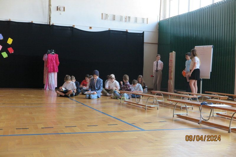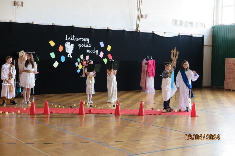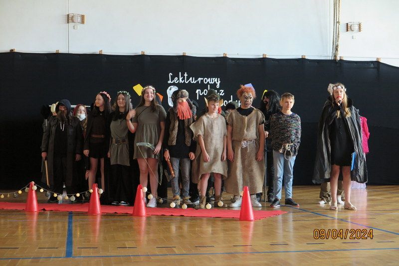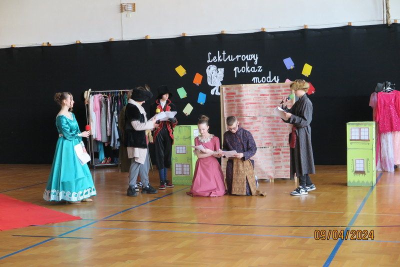 Tego dnia sala gimnastyczna zamieniła się w scenę, na której na specjalnie przygotowanym czerwonym dywanie swoje umiejętności aktorskie mieli okazję zaprezentować uczniowie. Zadanie polegało na tym, aby szkolne lektury przedstawić w ciekawy i niebanalny sposób. Udało się to znakomicie! Uczniowie udowodnili, że mają wspaniałe pomysły na interpretację wybranych przez siebie utworów, co przejawiało się w kostiumach, jakie stworzyli, scenografii, jak i grze aktorskiej.