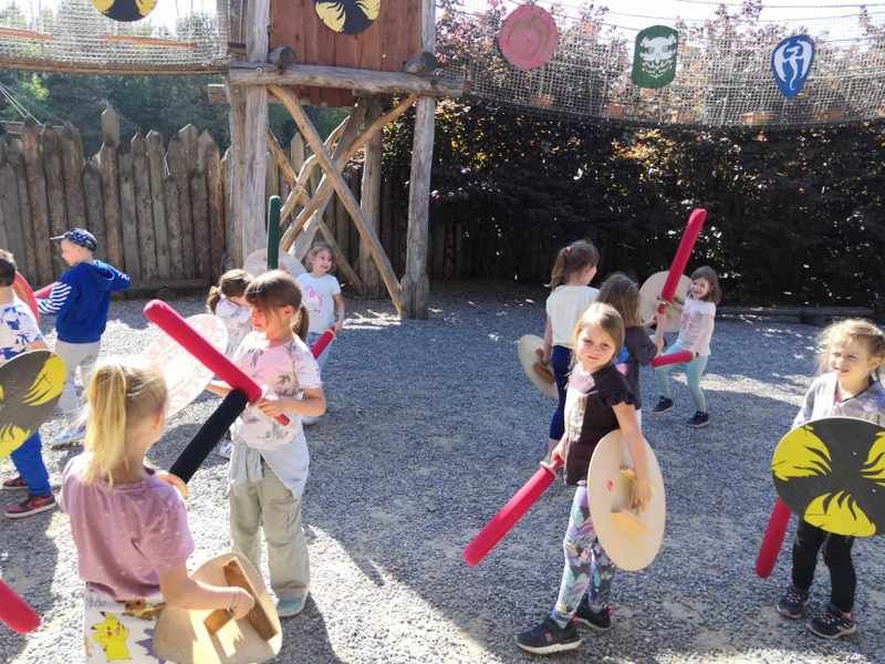 Na samym początku przywitały ich psotne i włochate Mordole oraz przesympatyczna i pracowita pani Bulwiak, która przeprowadziła na początek rozgrzewkę. Uczniowie mieli także okazję sprawdzić swoje siły w różnych konkurencjach, takich jak wyścigi drużyn czy przeciąganie liny. Pani Buwiak przedstawiła niesamowite historie związane z Magicznymi Ogrodami. Uczniowie mogli także zajrzeć z nią do jamy smoka, odwiedzić zamek wróżek czy przejść po magicznym wodospadzie. Po sytym obiedzie uczniowie wybrali się w dalszą podróż, podczas której odwiedzili groźnego Araga i jego mroczysko oraz przeszli szkolenie i rozegrali bitwę na miecze pod okiem dzielnego rycerza. Nie zabrakło zabaw na najróżniejszych konstrukcjach, platformach, na wyprawach ciemnymi tunelami, zjazdem na ogromnej zjeżdżalni czy spacerem po moście w koronie drzew. Na koniec każdy z uczniów mógł kupić sobie wybraną przez siebie pamiątkę. To był dzień pełen wrażeń, doskonałej zabawy i na pewno jeszcze tam wrócimy!