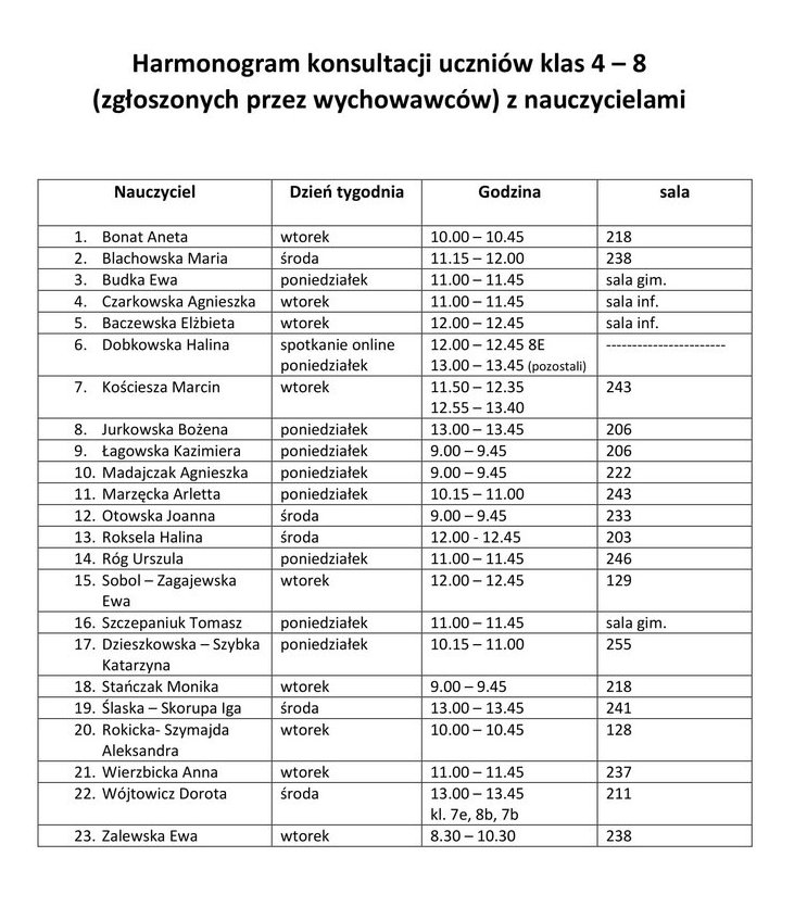 Harmonogram konsultacji uczniów klas 4 – 8 z nauczycielami