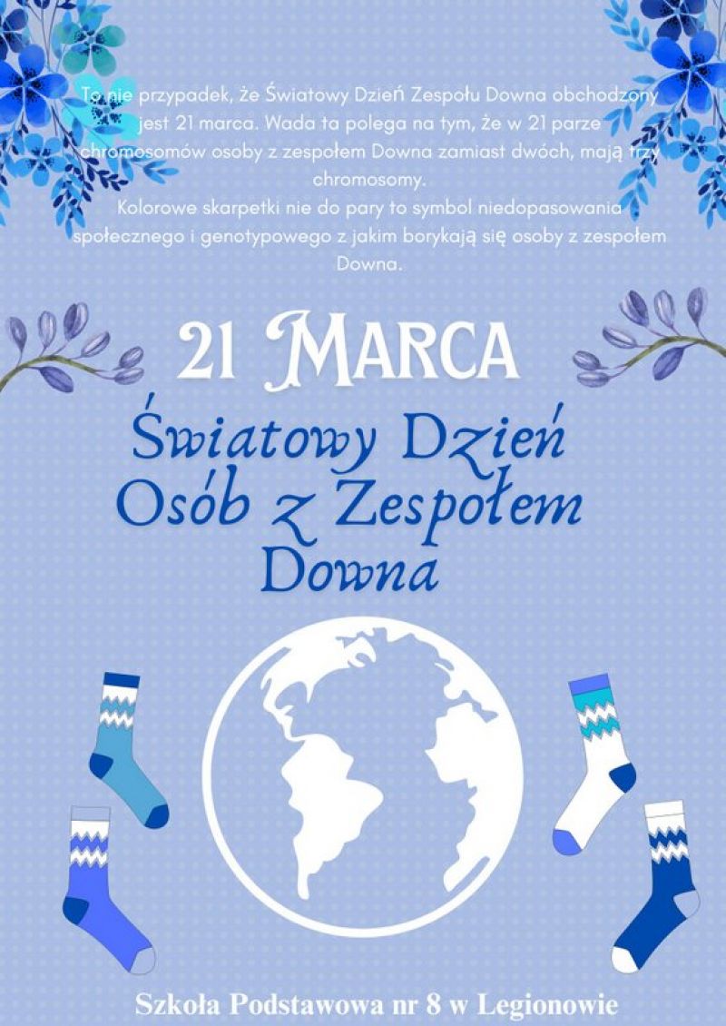 21 marca w SP8 obchodziliśmy Światowy Dzień Zespołu Downa. Inicjatywa ta ma na celu zwiększenie świadomości społecznej na temat tej wrodzonej choroby genetycznej, a także wsparcie dla osób z Zespołem Downa i ich rodzin. Symbolem Zespołu Downa są kolorowe skarpetki będące synonimem niedopasowania społecznego i genotypowego z jakim borykają się te osoby. Dlatego tego dnia uczniowie przyszli do szkoły w dwóch różnych skarpetkach. Młodsze klasy wzięły udział w Marszu Kolorowej Skarpetki, który odbył się w naszym mieście już po raz 7. Dzieci przeszły ulicami miasta od Rynku przy studni oligoceńskiej, ulicą Piłsudskiego do Ratusza Miejskiego. Tam spotkały się z prezydentem miasta Legionowo. Uczniowie klas starszych przeszli w marszu solidarności po szkole. Najstarsi natomiast w ramach lekcji informatyki zaprojektowali plakaty na tą okazję. Na korytarzach szkoły były wywieszone gazetki informacyjne, kolorowe skarpetki a na ekranach były wyświetlane prezentacje z okazji obchodów tego święta. Wszystkim uczestnikom bardzo dziękujemy za okazane wsparcie i solidarność z osobami z Zespołem Downa.