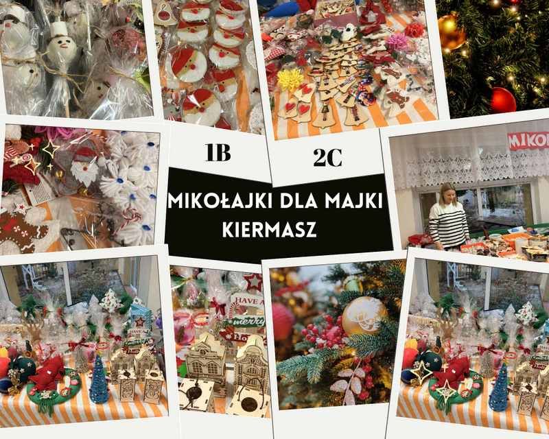 We czwartek 4 grudnia 2025r. w naszej szkole odbył się świąteczny kiermasz. Dzięki zaangażowaniu uczniów, nauczycieli i rodziców na stoiskach można było znaleźć ręcznie robione ozdoby bożonarodzeniowe, takie jak stroiki, bombki, zawieszki, kartki i dekoracje z różnych materiałów. Nie zabrakło też w tym roku uszytych przez Annę Pniewską świątecznych poduszek. Uczniowie wspólnie z rodzicami z klasy 1b oraz 2c przygotowali także różne świąteczne słodkości – pierniczki, babeczki, ciasteczka i inne przysmaki. Kiermasz wprowadził wszystkich w świąteczny nastrój. Dochód ze sprzedaży zostanie przeznaczony na konto fundacyjne Mai Rybickiej oraz wsparcie szkolnych inicjatyw – zakup naklejek podłogowych, aby uczniowie mogli spędzać aktywnie przerwy. Dziękujemy całej społeczności szkolnej za udział