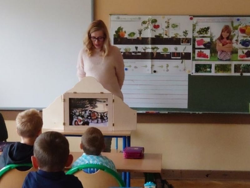 Tego dnia do klasy I a i klasy I c zamiast tradycyjnej książki czytanej na głos, prosto ze szklonej biblioteki zawitał teatrzyk kamishibai, czyli inaczej papierowy teatr (z japońskiego: kami-paier, shibai-sztuka), teatr obrazkowy. Jest to japońska forma opowiadania do dużych ilustracji, wykorzystująca kartonowe plansze z obrazkami i tekstem oraz drewnianą skrzynkę wzorowaną na parawanie z teatrzyków marionetkowych.