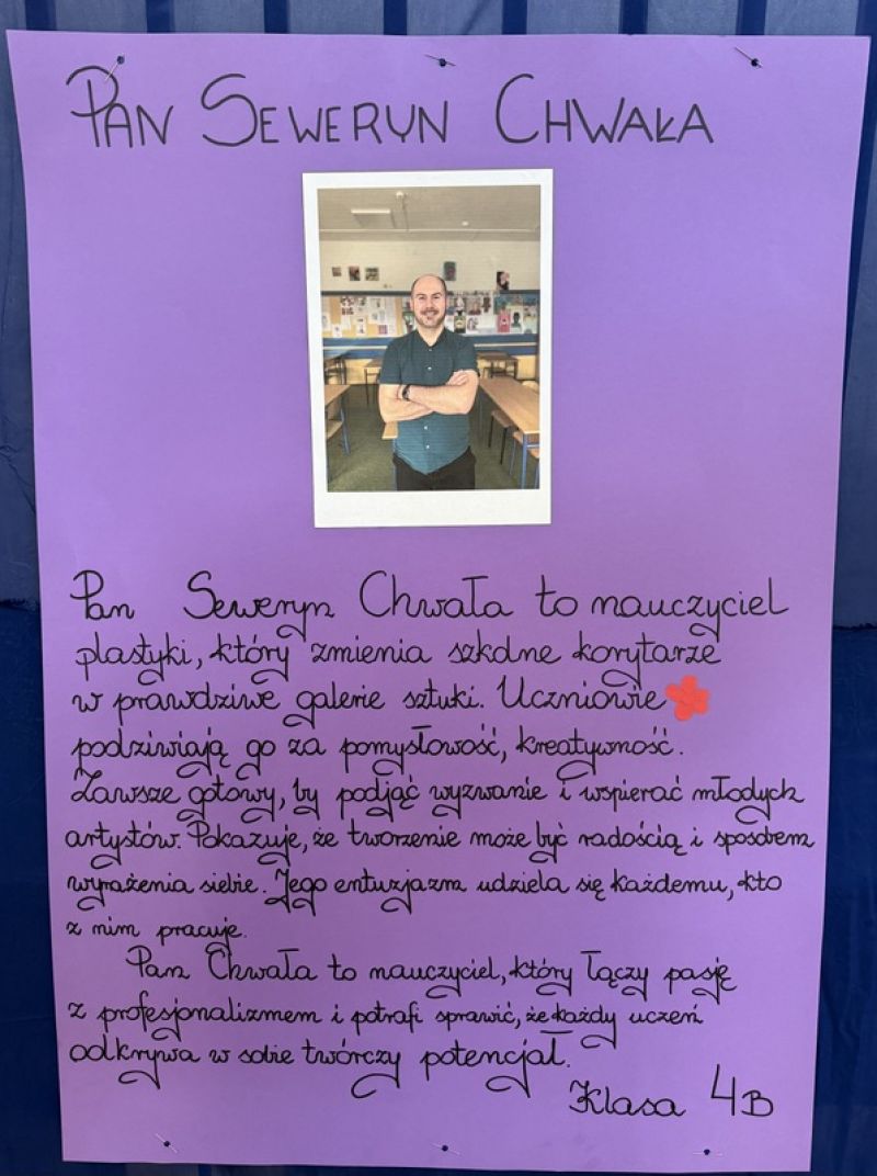 Poniżej prezentujemy plakaty przygotowane przez uczniów, przedstawiające sylwetki wychowawców biorących udział w tym etapie. Zachęcamy do zapoznania się z ich opisami, to doskonała okazja, aby lepiej poznać nauczycieli i docenić ich codzienną pracę oraz zaangażowanie.