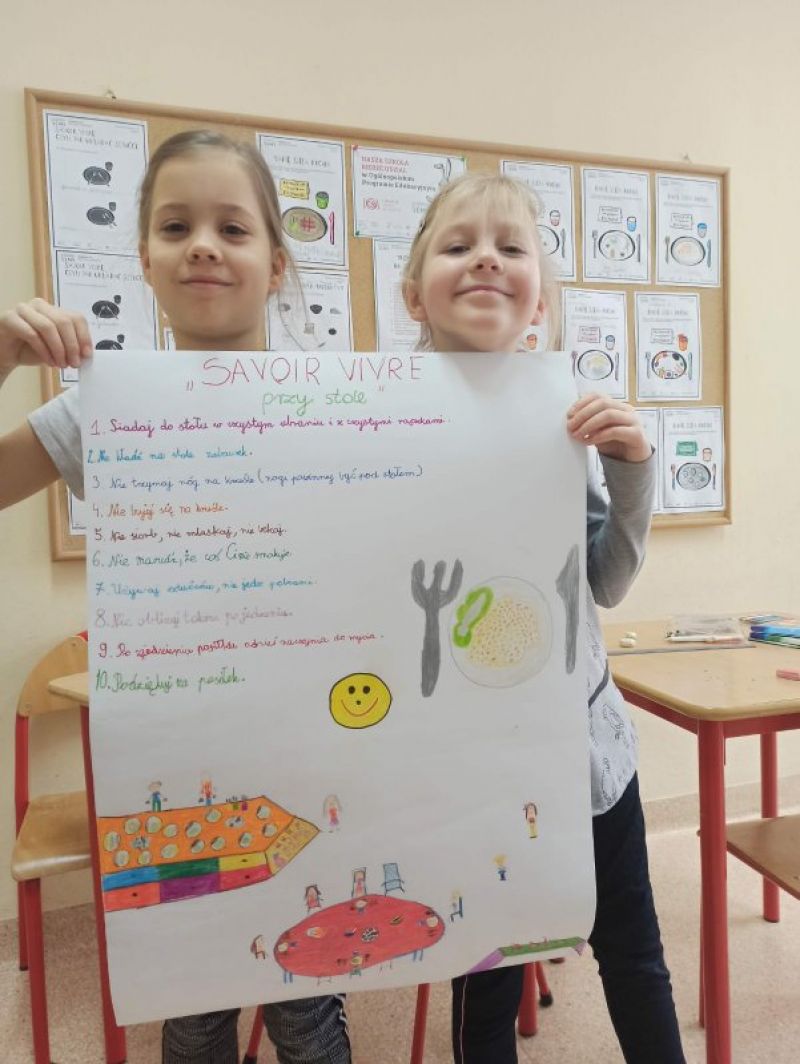 Następnie przenieśliśmy się do restauracji gdzie uczyliśmy się nakrywać do stołu i układać sztućce. Dzieci dowiedziały się, że sztućce na talerzu odpowiednio ułożone informują kelnera, co ma zrobić z naszym jedzeniem. Przypomnieliśmy sobie „Savoir Vivre, czyli jak zachować się przy stole”, wykonaliśmy plakat z zasadami. Po zasadach zamieniliśmy się w kucharzy i wykonaliśmy „Danie Szefa Kuchni”. Na koniec przeczytaliśmy fragment książki G. Kasdepke „Bon czy ton”.