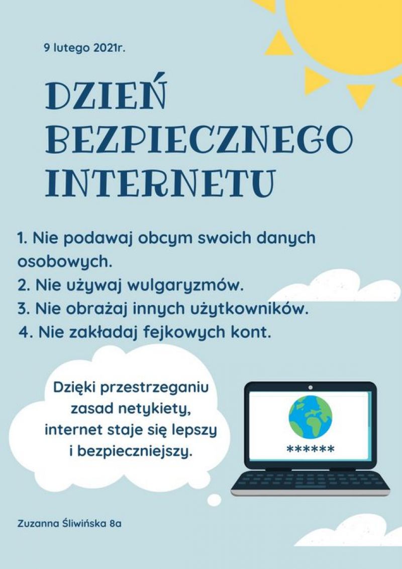 W naszej szkole Panie uczące informatyki przeprowadziły z uczniami serie lekcji związanych z bezpieczeństwem w Internecie. Na wstępnie uczniowie tworzyli, wykorzystując program canva, plakaty promujące wspomniany dzień. Opracowywali także zasady bezpiecznego korzystania z technologii. Pod kierunkiem nauczycieli wymieniali wady i korzyści z TIK. Na koniec zajęć Panie informatyczki przeprowadziły ankietę wśród uczniów. Wyniki ankiety zostały omówione w grupach z dziećmi. Wynika z nich, że uczniowie są świadomi zagrożeń wynikających z długiego przesiadywania przed komputerem. Niestety, martwi fakt, że oprócz lekcji online, wolny czas również spędzają korzystając z Internetu.