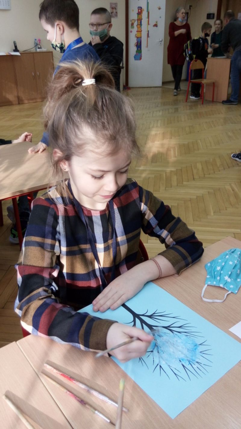 Tematem zajęć plastycznych było „Zimowe drzewo”.