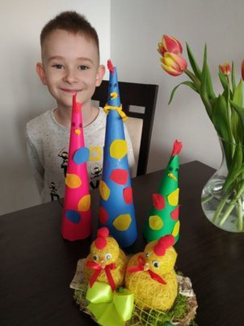 Rano w Niedzielę po czasie modlitwy wspólnie z naszymi rodzinami usiądziemy przy stole i podzielimy się święconymi jajkami z wcześniej przygotowanej święconki i złożymy sobie najlepsze życzenia. Nikomu nie może ujść na sucho drugi dzień świąt- śmigus dyngus! A my, uczniowie klasy 2e korzystając z okazji chcielibyśmy pochwalić się wykonanymi z papieru kurczaczkami oraz złożyć wszystkim życzenia!