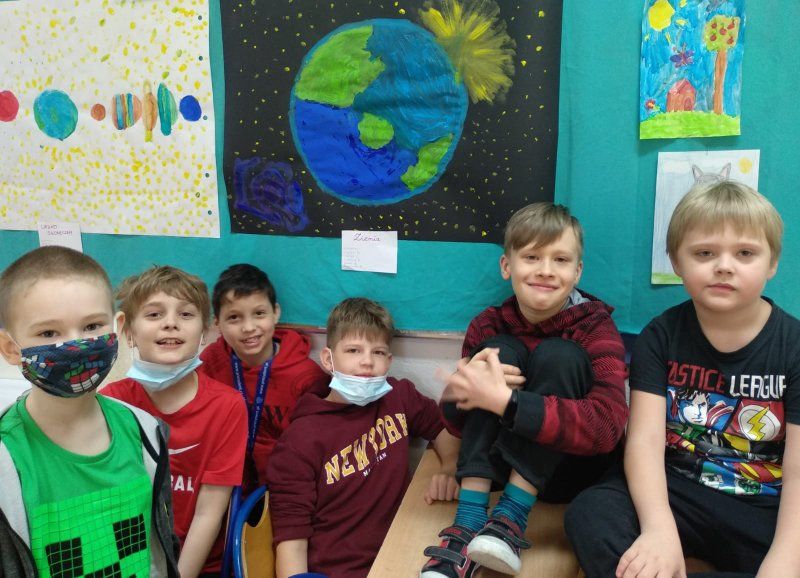 Z tej okazji uczniowie klas II i III w świetlicy obejrzeli film edukacyjny opowiadający o naszej galaktyce, rozwiązywali krzyżówki, rebusy i zagadki dotyczące Układu Słonecznego. Połączyliśmy się z kamerami NASA, gdzie na żywo mogliśmy oglądać prace astronautów i to, co oni obserwują z okien statku kosmicznego. Na koniec uczniowie wykonali prace plastyczne i uczyli się piosenki „W Układzie Słonecznym”.