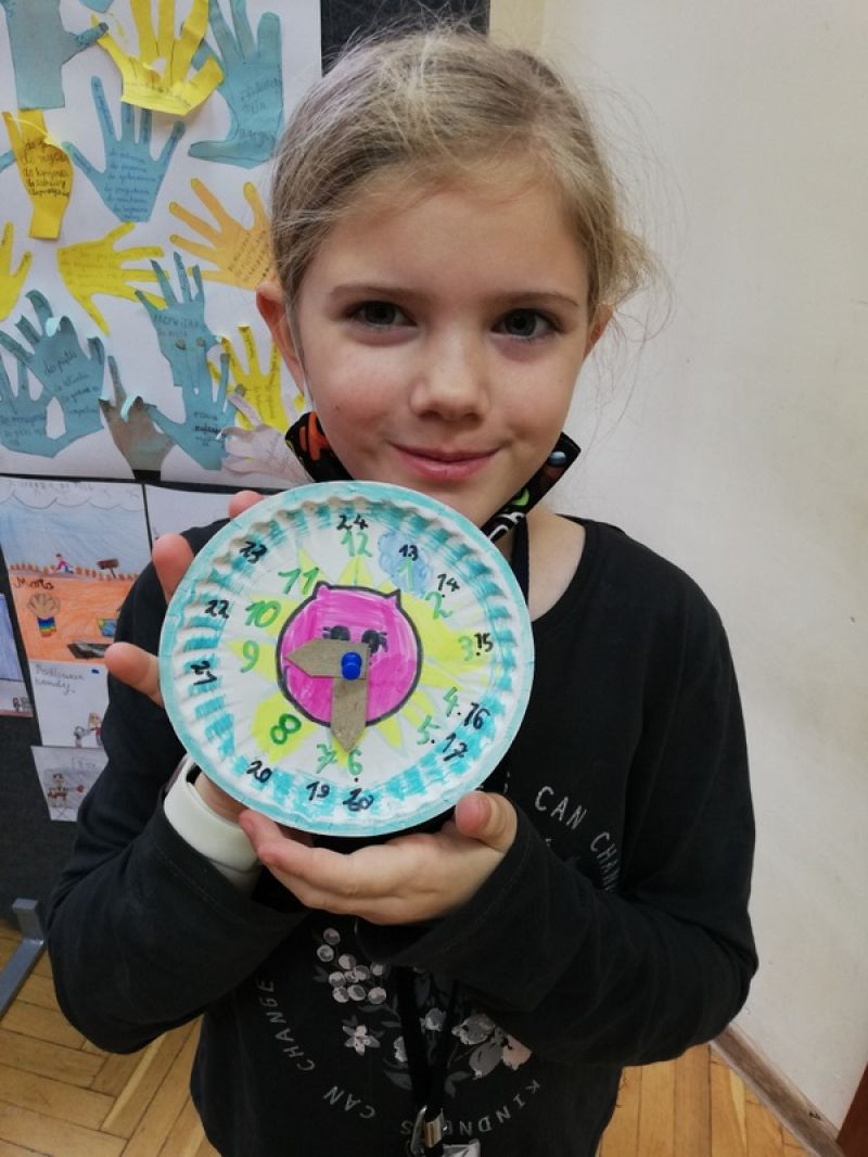 Uczniowie samodzielnie wykonali tarczę zegara analogowego na papierowych talerzykach. Każdy ozdobił swój zegar według własnego pomysłu. Następnie ćwiczyliśmy umiejętność rozpoznawania godzin i minut. Rozmawialiśmy o rytmie dnia i odczytywaniu na zegarze godzin w systemie 24-godzinnym. Na koniec obejrzeliśmy odcinek „Jak mierzono czas” z francuskiej serii animowanej „Były sobie odkrycia”, w którym mowa była o różnych rodzajach zegarów - piaskowych, mechanicznych, wahadłowych i atomowych.