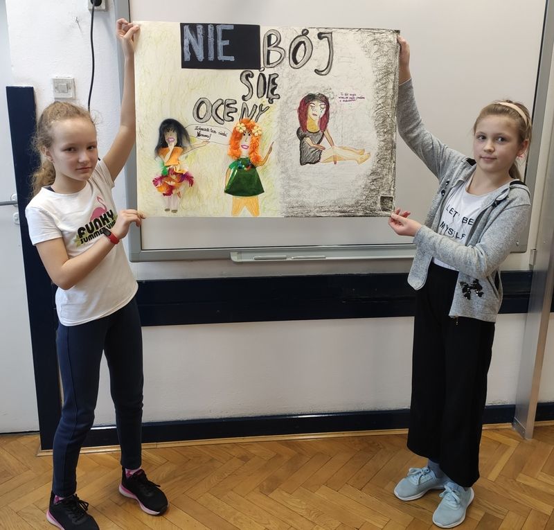 Uczniowie klasy IV b pod kierunkiem Pani Ewy Dziury i Pani Moniki Nałęcz wzięli udział w Ogólnopolskim Projekcie Edukacyjnym „Mutyzm wybiórczy – o lęku bez lęku”. Został on objęty honorowym patronatem Rzecznika Praw Dziecka. Celem ww. przedsięwzięcia było rozpowszechnienie wiedzy o zaburzeniu lękowym, jakim jest mutyzm wybiórczy. Uczniowie w czasie zajęć z wychowawcą poznali, czym jest zaburzenie lękowe nazywane mutyzmem wybiórczym, a także wykazali się wiedzą, rozwiązując zadania o trzech stopniach trudności. Zwieńczeniem projektu było napisanie pracy na temat: Jak rozumiesz słowa „Milczenie nie zawsze jest złotem” w odniesieniu do omawianego zagadnienia oraz wykonanie plakatu. Wszyscy uczniowie sprostali ww. wymaganiom i poradzili sobie z nimi na medal. A oto fragmenty kilku prac zredagowanych przez uczniów: „Powiedzenie „Milczenie jest złotem” w szczególny sposób dotyczy osób dotkniętych mutyzmem wybiórczym. Sytuacja stresowa nie pozwala im mówić. Osoby te chciałyby się odezwać, ale strach nie pozwala im tego zrobić. Najlepiej czują się w swojej strefie komfortu. Gdy tylko coś lub ktoś zakłóci ich spokój, przestają mówić, ściszają głos lub odwracają się od przypadkowego obserwatora.” „Dziecko dotknięte mutyzmem wybiórczym, jeśli nie otrzyma odpowiedniej pomocy, będzie nieszczęśliwym człowiekiem. Może czuć się wykluczone społecznie.” „Ludzie z mutyzmem wybiórczym często są odbierani jako dziwni i aspołeczni.” „Milczenie dla takiego dziecka jest ogromnym cierpieniem. Potrzebuje ono zrozumienia i pomocy w pokonaniu lęku przed rozmową.” „Milczenie w przypadku osób dotkniętych mutyzmem wybiórczym jest lękiem, strachem, niepokojem. Każdy z nas jest inny: jeden wysoki, drugi niski, gruby czy chudy, wesoły i smutny. Niektórzy mają białą cerę, inni żółtą lub ciemną. Mimo różnic, jakie nas dzielą, powinniśmy akceptować wszystkich takimi, jacy są.” „Postawienie właściwej diagnozy jest bardzo ważne. Dzięki temu osoby dotknięte tym zaburzeniem oswajają się ze swoim strachem i powoli mogą cieszyć się pełnią życia, a także spełniać swoje marzenia.” „W naszym kraju październik jest miesiącem na temat świadomości mutyzmu wybiórczego. To problem bardzo wielu osób, nie tylko dzieci, ale również nastolatków i dorosłych. Cieszę się, że wzięłam udział w tym projekcie i poznałam, na czym polega zaburzenie lękowe – mutyzm wybiórczy. Teraz jestem w stanie rozpoznać osobę z tym problemem i będę wiedziała, jak się zachować wobec niej.”