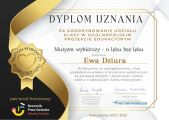 Uczniowie klasy IV b wraz z opiekunami – Panią Ewą Dziurą i Panią Moniką Nałęcz otrzymali certyfikat za udział w Ogólnopolskim Projekcie Edukacyjnym „Mutyzm wybiórczy – o lęku bez lęku”. Został on objęty honorowym patronatem Rzecznika Praw Dziecka Pana Mikołaja Pawlaka. Prezes Polskiego Towarzystwa Mutyzmu Wybiórczego - Pani Elżbieta Falkowska pogratulowała uczniom prawidłowego wykonania zadań z zakresu wiedzy o mutyzmie wybiórczym i podziękowała za chęć poszerzenia wiadomości o tym zaburzeniu lękowym oraz za postawę empatii i życzliwości wobec osób z trudnościami komunikacyjnymi. Pani Anna Czujak – autorka projektu, napisała: „Muszę przyznać, że wykonane przez klasę prace są naprawdę na wysokim poziomie – zarówno pod względem estetycznym, jak i merytorycznym.”