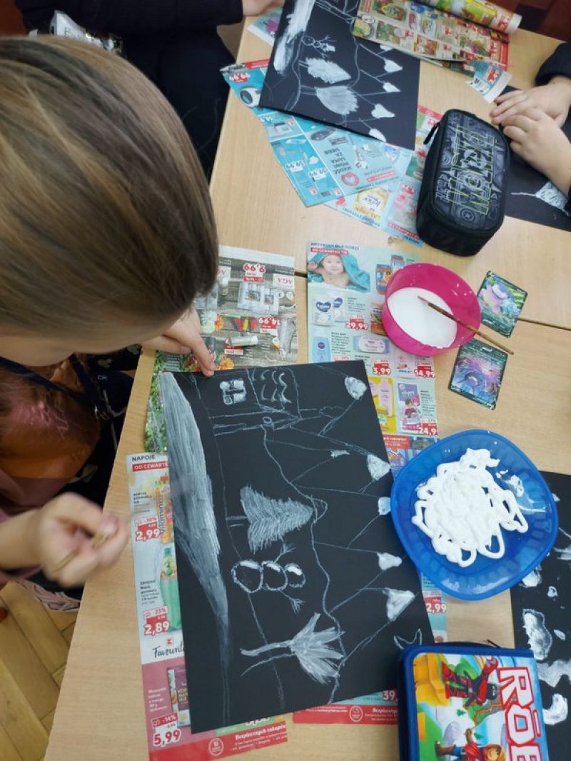 Rysunki dzieci przeważnie są kolorowe, jednak namalowanie pejzażu zimowego wiąże się głównie z operowaniem różnymi odcieniami bieli i szarości.
