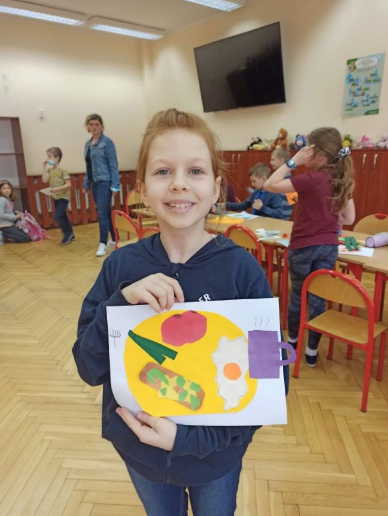 Uczniowie dowiedzieli się, że jest to najważniejszy posiłek w ciągu dnia, który daje nam siłę i moc na resztę dnia. Śniadanie to najlepszy start w nowy dzień. dzieci wykonały swój talerz ze śniadaniem, które lubią najbardziej. Na zakończenie zajęć odnieśliśmy się do powiedzenia „Jesteś tym, co jesz” i wykonaliśmy do niego rysunki.