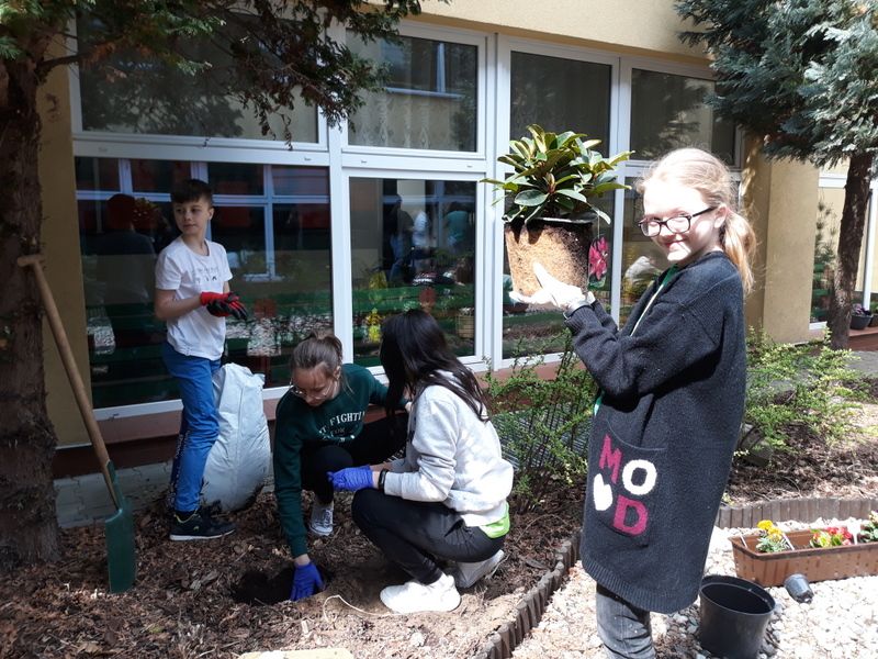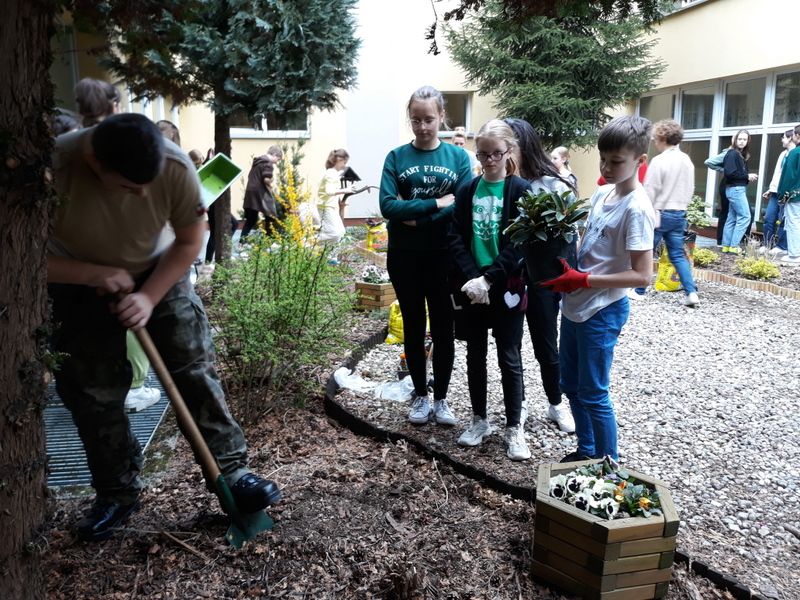 W piątek, 27 kwietnia obchodziliśmy Dzień Ziemi. Tego dnia uczniowie wraz z wychowawcami i pozostałymi nauczycielami wzięli udział w zaplanowanych akcjach. Wydarzenie rozpoczęliśmy od wysłuchania audycji "Dźwięki Ziemi" i "Muzyka Ziemi". Następnie każda klasa przystąpiła do sadzenia kwiatów i innych przygotowanych roślin, w ten sposób zagospodarowaliśmy parapet w patio. W drugiej kolejności uczniowie z klas 6-7 wzięli udział w grze terenowej przygotowanej przez nauczycieli biologii i geografii. Na koniec każda klasa grupowo przygotowała plakat na określony temat.