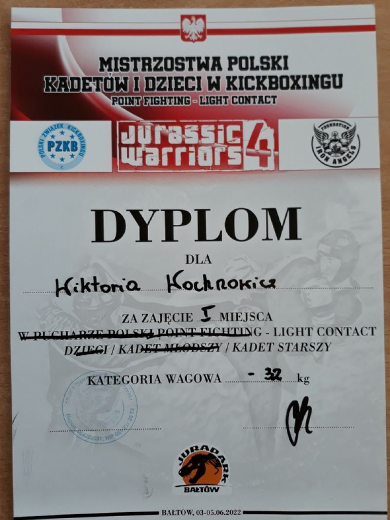 W długi czerwcowy weekend (4-6.06) w Bałtowie odbyły się Mistrzostwa Polski w Kickboxingu w formułach Pointfighting i Light Contact. Rywalizacja odbywała się w trzech grupach wiekowych: Dzieci (7-9lat), Kadet młodszy (10-12lat) i Kadet Starszy (13-15lat). W zawodach wzięła udział rekordowa ilość 663 zawodników z 65 klubów. Klub „Tajfun” z Legionowa reprezentowała uczennica klasy 7d Wiktoria Wochnowicz, która zdobyła w obu kategoriach pierwsze miejsca. Serdeczne gratulacje dla Wiktorii i trenera, Pana Tomasza Szczepaniuka.