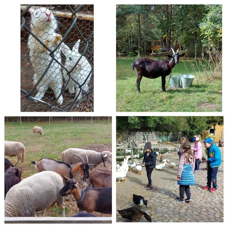 21 września 2022 r. uczniowie klasy 1 a i 2 a wraz z p. Donatą Maciąg, p. Anną Choduń i wychowawcami odwiedzili interesujące miejsce… Wymysły pod lasem. Przywitała ich tam właścicielka gospodarstwa wraz z pracownikami, słoneczna pogoda, odgłosy zwierząt oraz zapach jesiennych darów i dymu z ogniska. Po przyjeździe oczom dzieci ukazał się obraz na którym w centralnej części stała duża, pięknie zdobiona stara chata, a wokół niej ogród, drzewa owocowe, pole, łąka, warzywnik, zagrody dla różnych zwierząt, usypane z piasku górki zapraszające do zabawy, ognisko z wielkim garnkiem przypominające starego żurawia, domy z których każdy miał inne przeznaczenie i wygląd. Mnóstwo tam było niezwykłych sprzętów, maszyn, narzędzi, ozdób, dekoracji i przedmiotów, które często można spotkać już tylko w skansenach.