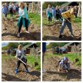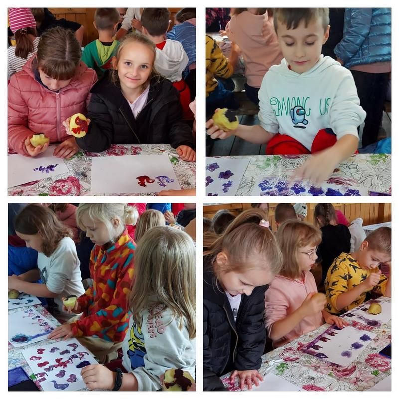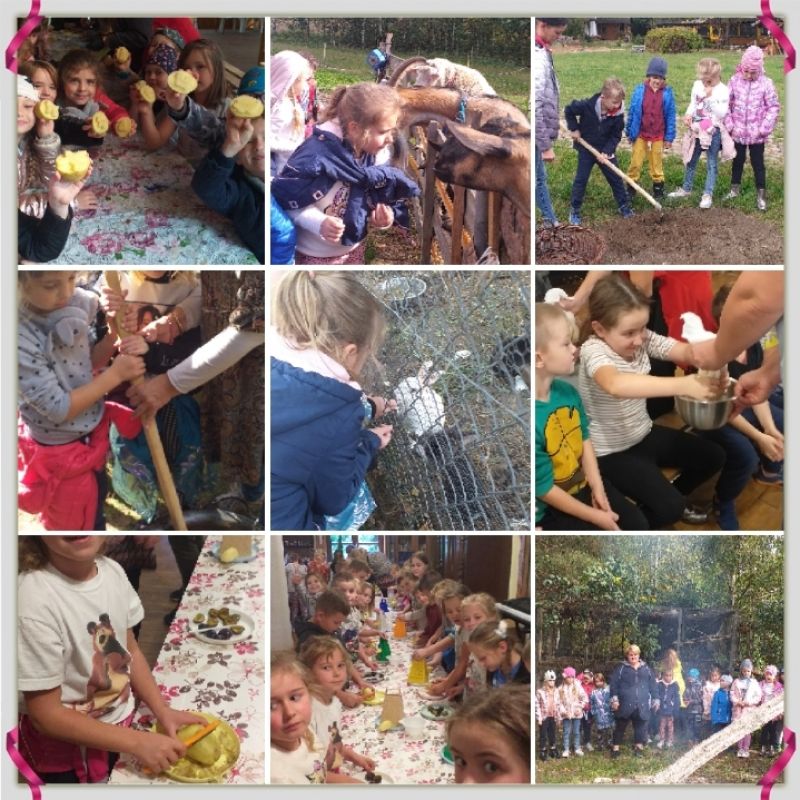 Po śniadaniu wszystkie dzieci zostały zaproszone do obejrzenia przedstawienia, w którym same wzięły udział. Ubrane w stroje, przy dźwiękach muzyki odegrały sceny przedstawiające historię ziemniaka. Następnie poznały budowę tej rośliny, jej przeznaczenie i walory kulinarne. Potem zajęły się obieraniem ziemniaków, ścieraniem ich na tarce i wyciąganiem pestek ze śliwek. Dlaczego śliwek? Bo posłużyły do zrobienia kisielu, a ten potrzebował mąki ziemniaczanej… Najpierw jednak doświadczyły w jaki sposób można ją otrzymać i dlaczego należy zetrzeć ziemniaki na tarce, chcąc zrobić z nich placki. Gdy te się smażyły kolejne grupy dzieci odwiedzały zagrody pełne kaczek, gęsi, owiec i kóz, które pozwalały się głaskać i karmić oraz ogród pełen warzyw, w którym poznały m.in. topinambur. Miały także niecodzienną okazję wziąć udział w wykopkach, nakarmić prześliczne, puchate króliki i przyjrzeć się majestatycznemu, białemu bażantowi. Po zjedzeniu placków i wypiciu własnoręcznie zrobionego kisielu stworzyły obrazy z ziemniaczanych stempli. W przerwach chętnie i twórczo bawiły się w piasku używając do zabaw wyobraźni, patyków, dużych plastikowych łopat i wiader. Zaprzyjaźniły się też z psem, który spokojnie przyglądał się ich zabawom. Tuż przed wyjazdem upiekły i ze smakiem zjadły przywiezione kiełbaski i tamtejsze ziemniaki. To był dzień pełen wrażeń i wspaniały sposób na poznawanie świata.