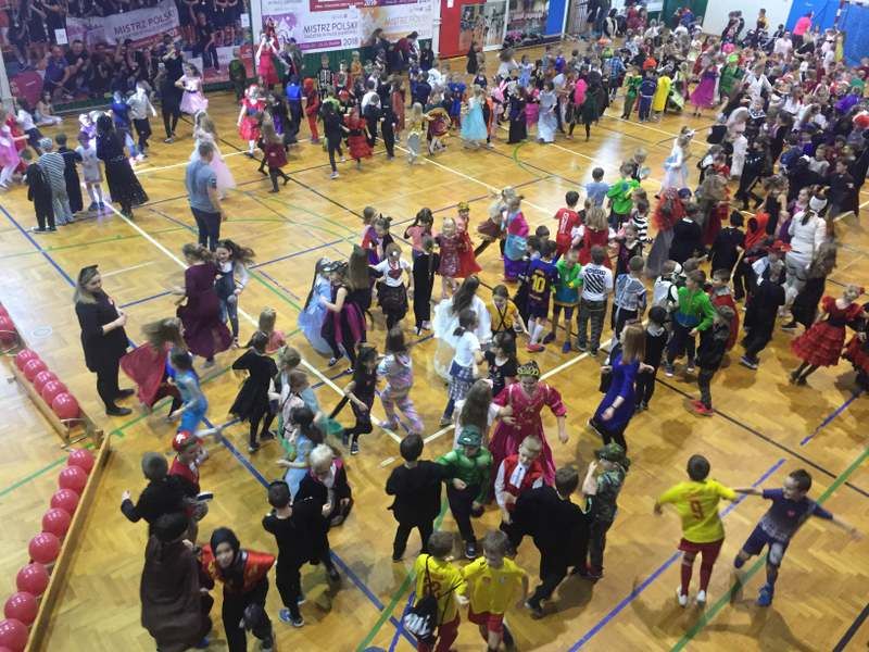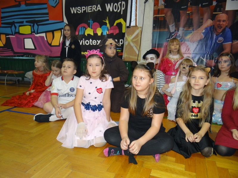 10 stycznia 2020 r. punktualnie o 10. 00 salę gimnastyczną wypełnił barwny korowód bajkowych postaci, osobliwych stworów, bohaterów rodem z gier komputerowych, filmów i książek. Przybyły do nas także przedszkolaki z zaprzyjaźnionego Przedszkola Miejskiego nr 3 i nr 11. W tym wyjątkowym dniu każdy mógł być tym, kim chciał, mógł tańczyć to, co chciał i śpiewać jak umiał. Najważniejszy był dobry humor, koleżeńska postawa i pomysł na wspólną zabawę. Po uroczystym otwarciu dokonanym przez panią dyrektor bal poprowadził pan Piotr Koperski, tata ucznia z klasy 2 d. Przy dźwiękach dobrej muzyki i w blasku kolorowych świateł zabawom i konkursom nie było końca. Najmłodsi mierzyli się z tańcem w parach na coraz mniejszych gazetach, nieco starsi musieli wykazać się refleksem, najstarsi zaś musieli przejść pod opadającą poprzeczką nie dotykając rękami podłogi. Zwycięzcy konkursów oraz pozostali uczestnicy balu zostali obdarowani słodkościami, które zafundowała dzieciom Rada Rodziców. Bal trwał ponad dwie godziny i stanowił radosną formę integracji szkolnej społeczności – dzieci, nauczycieli i rodziców. Dochód z balu został przeznaczony na rzecz Wielkiej Orkiestry Świątecznej Pomocy dzięki czemu świetna zabawa stała się jednocześnie formą bezinteresownej pomocy.