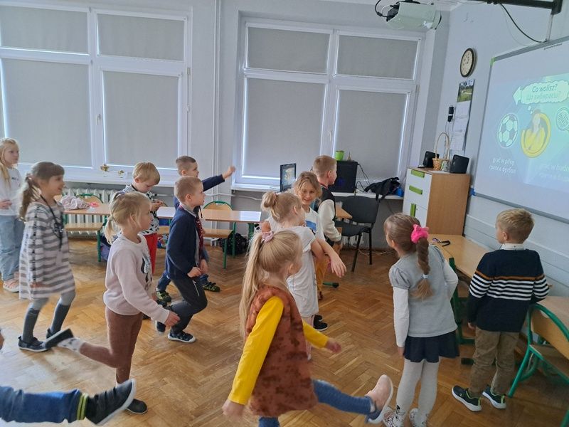 Uczniowie klas 1-3 bawili się razem z Akademią Krokieta i Lamy zaczynając od zabawy muzyczno-ruchowej a kończąc na wyścigach rzędów.