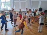Uczniowie klas 4-6 zaczęli swoją zabawę na hali sportowej, rozruchem przy muzyce a później rywalizując między sobą w konkurencjach sprawnościowych świetnie się bawiąc.