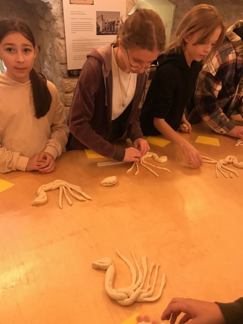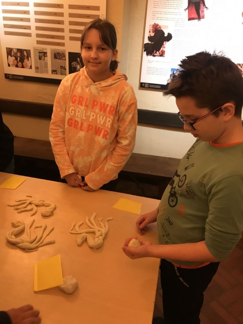 Zwiedzanie rozpoczęliśmy od serca Kazimierza - rynku, gdzie podziwialiśmy renesansowe kamieniczki, studnię oraz płaskorzeźby zdobiące fasady budynków. Spacerując uliczkami Kazimierza wysłuchaliśmy legendy dotyczącej psa Werniksa i pogłaskaliśmy na szczęście nos posągowego czworonoga. Zatrzymaliśmy się też przy kościele Farnym, w jego wnętrzu zobaczyliśmy jedne z najstarszych organów w oprawie modrzewiowej, a Pan Przewodnik opowiedział nam jego historię. W drodze powrotnej zabytkowymi uliczkami udaliśmy się na jedno z najbardziej znanych miejsc w Kazimierzu - Górę Trzech Krzyży, Zamek i Basztę z XIII wieku. Nagrodą za wspinaczkę były piękne widoki panoramy miasta. Ostatnim etapem naszej wycieczki były warsztaty z lepienia kogutów kazimierskich - każdy z uczniów nauczył się trudnej sztuki wyplatania koguta z ciasta drożdżowego - by na koniec móc delektować się smakiem legendarnych wypieków.