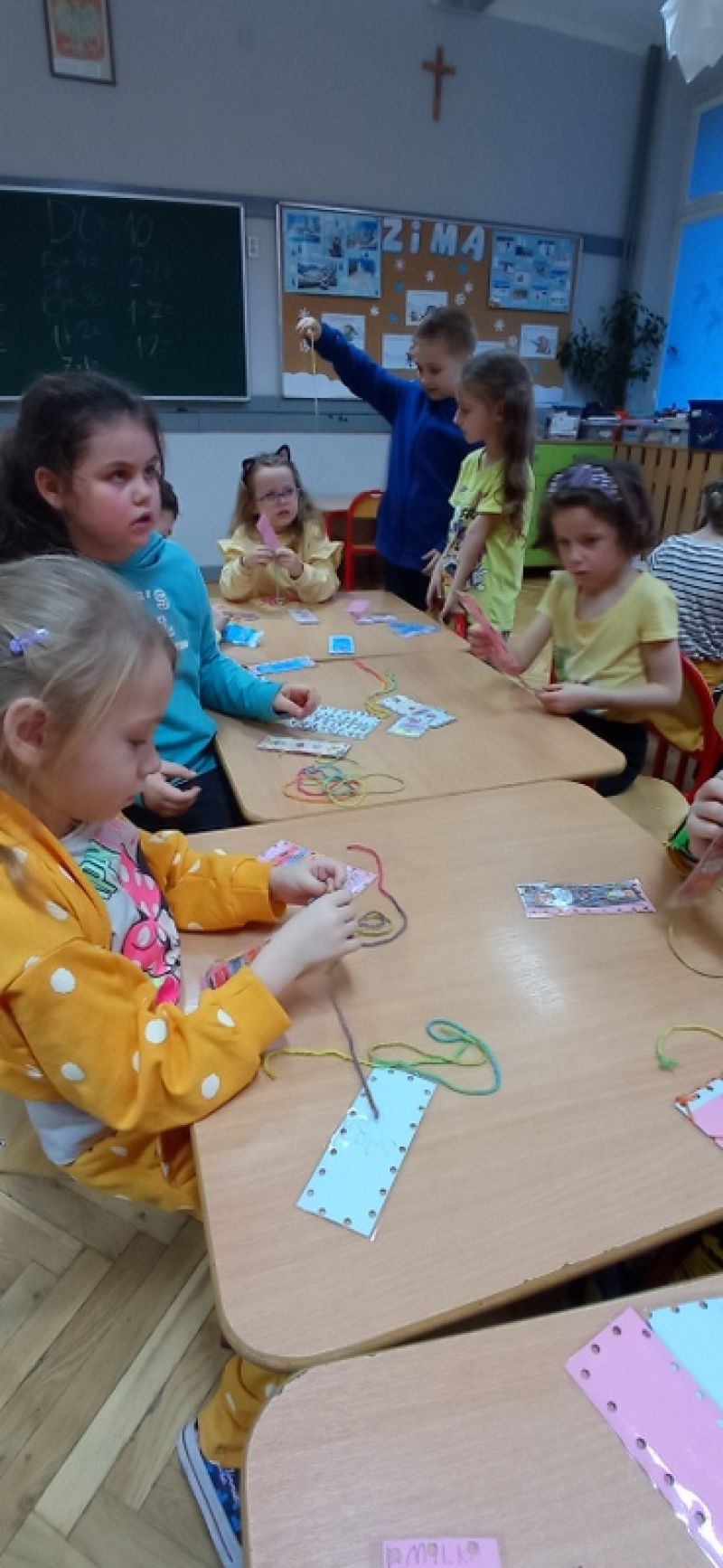 Dzieci z oddziału przedszkolnego wykonały piękne zakładki do książek w prezencie dla swoich Babć i Dziadków. Zaangażowanie było ogromne, a zadanie dość trudne, bo polegało na "obszyciu" zakładek włóczką. Mamy nadzieję, że wszystkim obdarowanym prezent się podobał.