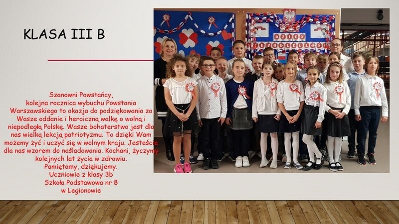 Na lekcjach języka polskiego uczniowie klasy 6c wysłuchali dwuczęściowego słuchowiska „Mały” roznosiciel nadziei i zrealizowali zadania z nim związane. Układali plan wydarzeń, dyskutowali o emocjach bohaterów i interpretowali fragmenty wiersza Krystyny Krzewskiej „Mądrość”. Siódmoklasiści obejrzeli odcinek programu Co za historia dotyczący Powstania Warszawskiego i w oparciu o zdobyte wiadomości wykonywali infografiki dotyczące wybranych zagadnień poruszonych w filmie. Uczniowie 7a i 6c na języku polskim pracowali pod kierunkiem pani Beaty Szymańskiej.
